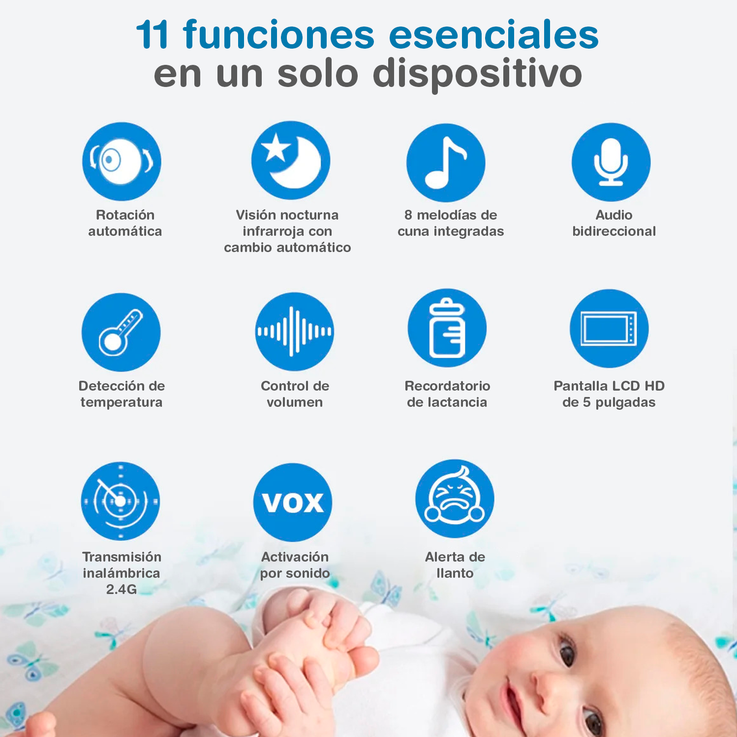 Asegura la tranquilidad de tu familia con esta cámara inteligente diseñada para acompañarte en cada etapa del sueño de tu bebé. Su pantalla de 5 pulgadas y sus 11 funciones integradas permiten monitorear de forma clara y segura desde cualquier rincón del hogar.